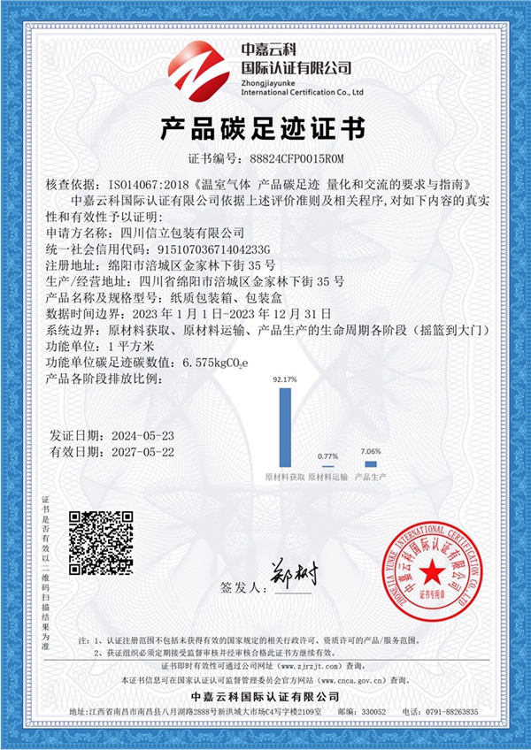 ? ? ? ?根據(jù)企業(yè)發(fā)展需要,現(xiàn)對(duì)CFP:紙質(zhì)包裝箱、包裝盒的生命周期的產(chǎn)品碳足跡;GHG:組織邊界范圍內(nèi)【四川省綿陽(yáng)市涪城區(qū)金家林下街35號(hào)的四川信立包裝有限公司】所涉及的溫室氣體碳排放管理相關(guān)活動(dòng)等相關(guān)認(rèn)證核查予以公示,接受社會(huì)監(jiān)督。